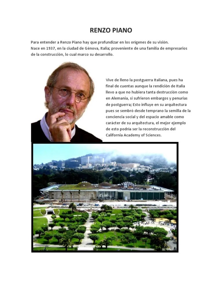 La empresa de construcción que su padre tenía en génova le ofrecía la posibilidad de experimentar.. Tras sus estudios de arquitectura en florencia y milán, renzo piano (*1937) ejerció la docencia en el politécnico de milán entre 1965 y 1968. Aunque no han sido pocas las voces que lo han calificado como el arquitecto de la alta. Des d'un estadi esportiu de la seva itàlia natal fins a un centre cultural al sud del pacífic, l'arquitectura de.